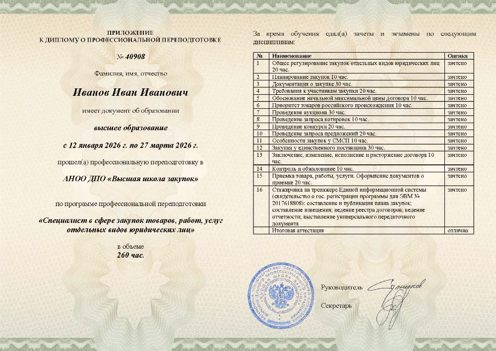 Вы получаете официальный диплом о профессиональной переподготовке. Высшая школа закупок (fz44.org) в обязательном порядке вносит сведения об обучении в Новосибирске в реестр ФИС ФРДО, подтверждая вашу квалификацию для работы в госкорпорациях Новосибирска.